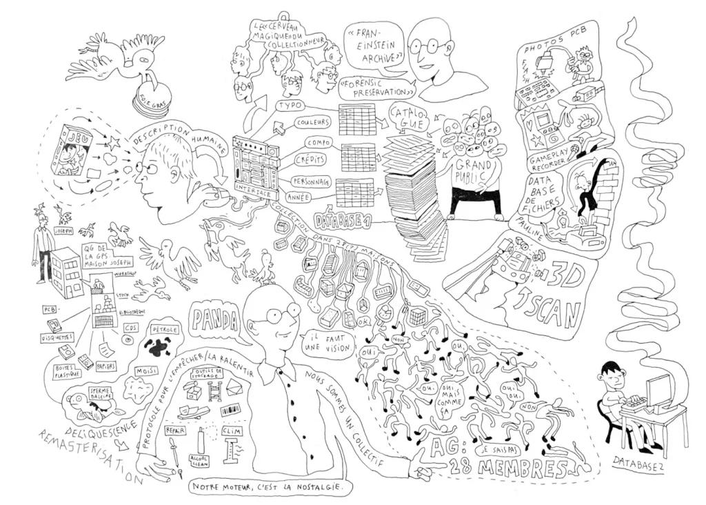 Pendant cette résidence à DROP! je mettrai une recherche de doctorat dessinée en cours de rédaction à l’épreuve de l’espace d’exposition. Il s’agit d’ouvrir l’atelier d’une « bande dessinée en train de se faire » et de modifier la suite du récit en échangeant avec le public. La thèse analyse comment les pratiques matérielles liées aux secondes vies des objets électroniques de la Pop Culture produisent des formes situées de connaissance. À partir d’une ethnographie de collectifs, forums, associations et musées en ligne, elle examine les milieux techniques et culturels au sein desquels circulent ces objets. En mobilisant dessin, BD (la thèse est en majeure partie rédigée sous cette forme) et méthodes graphiques, elle propose une anthropologie multimodale articulant récit et diagramme. L’étude montre aussi comment la nostalgie — moteur affectif, politique et esthétique — façonne la survie, la circulation et la transformation de ces objets dans les ruines de la pop culture.